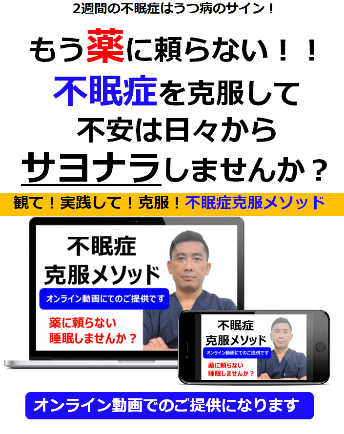 当院の統計では、うつ病の方90%以上の方が不眠症に悩まされている現実があります。不眠症を改善しなければ、うつ病になってしまうリスクがあるという事があり今回の【不眠症克服メソッド】を作成いたしました。